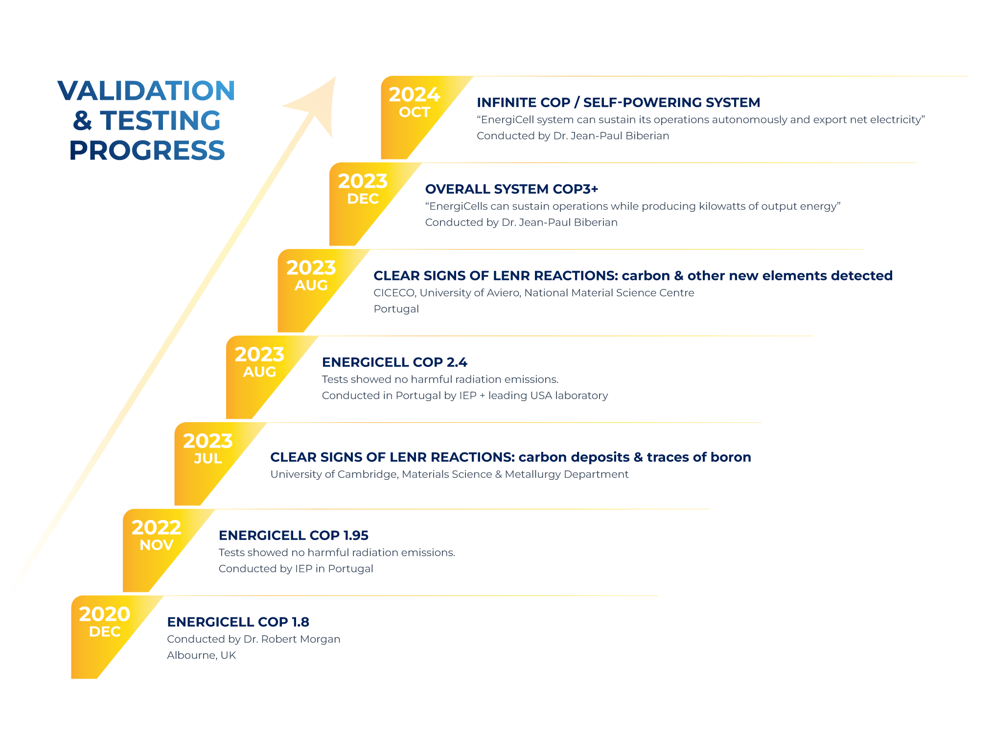 An EnergiCell was first independently validated in the UK in December 2020 by Dr. Robert Morgan (then Professor of Thermal Propulsion Systems), acting in an independent consulting capacity. The independent validation showed that 1.8x more energy in the form of heat was released than from the electricity used to power the EnergiCell, the Q1.8.